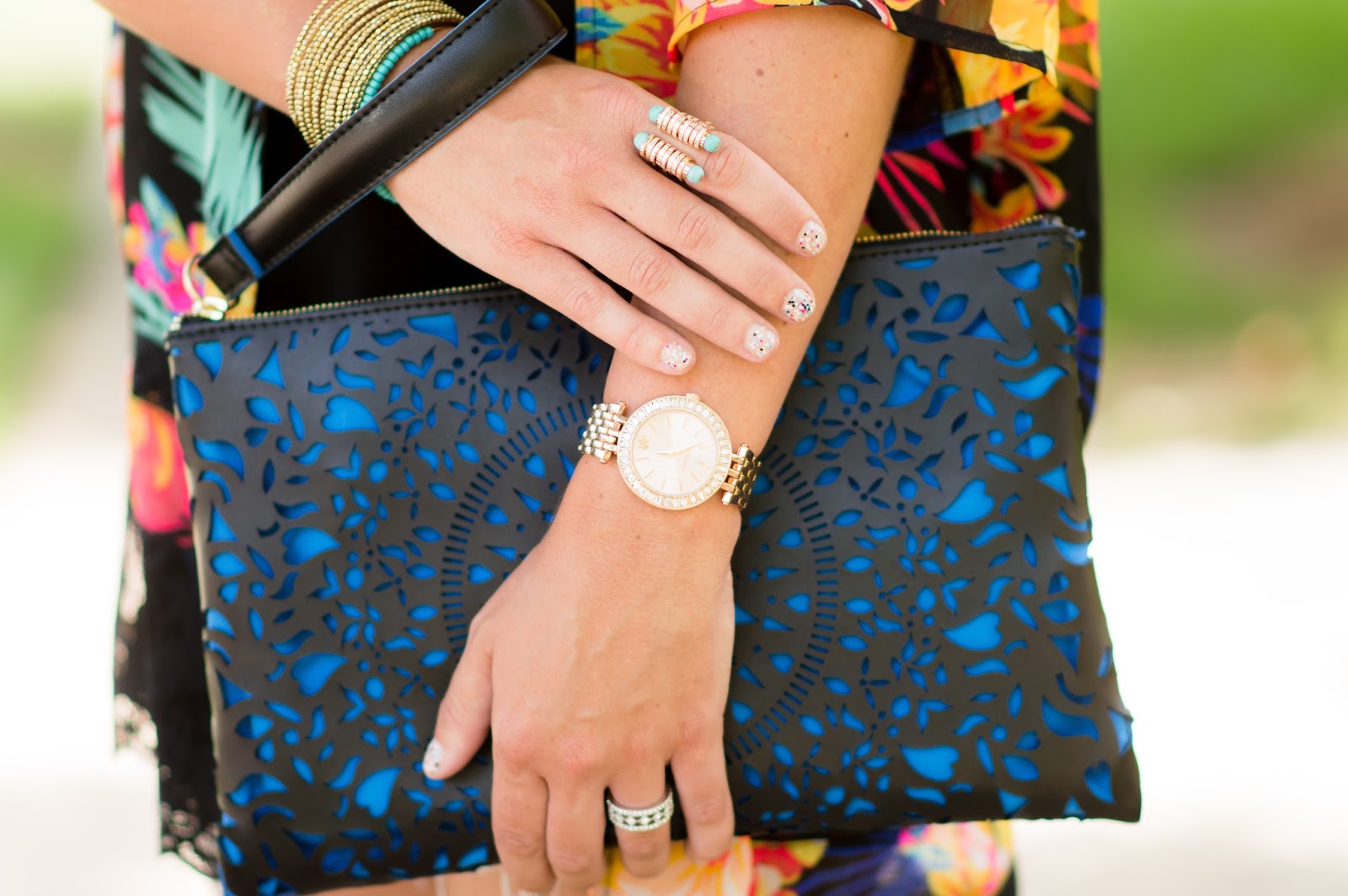 FLORAL KIMONO: CANDIE’S FOR KOHL’S (ON SALE FOR $15) | TANK: DILLARDS | SHORTS: OLD NAVY (SIMILARY STYLE HERE) | WEDGES: APT 9 FOR KOHL’S (SIMILAR HERE) | BANGLE: STELLA & DOT | RING: CHARMING CHARLIE | POLISH: CHARMING CHARLIE | WATCH: WRISTOLOGY WATCHES (USE CODE “KB20” TO RECEIVE 20% OFF ANY WATCH) | NECKLACE: PURPLE PERIDOT (LOVE THIS ONE HERE) | CLUTCH: TJMAXX FIND | SUNGLASSES: JUICY COUTURE FOR KOHL’S (LOVE THESE)