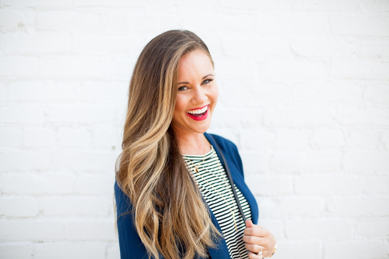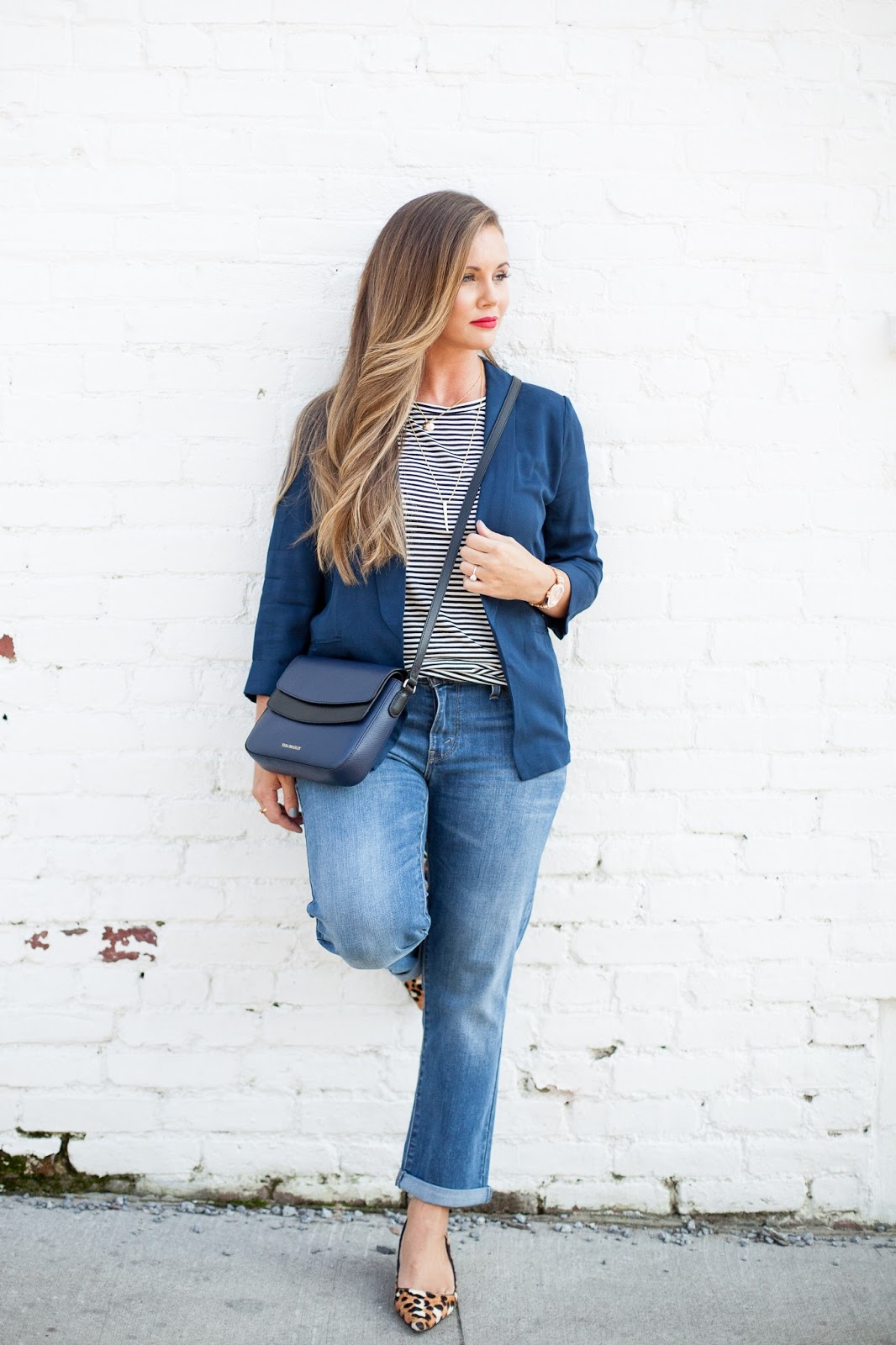 I love this look–the stripes, the blazer, the jeans…everything is just perfect for fall! Going to have to pin this one 🙂