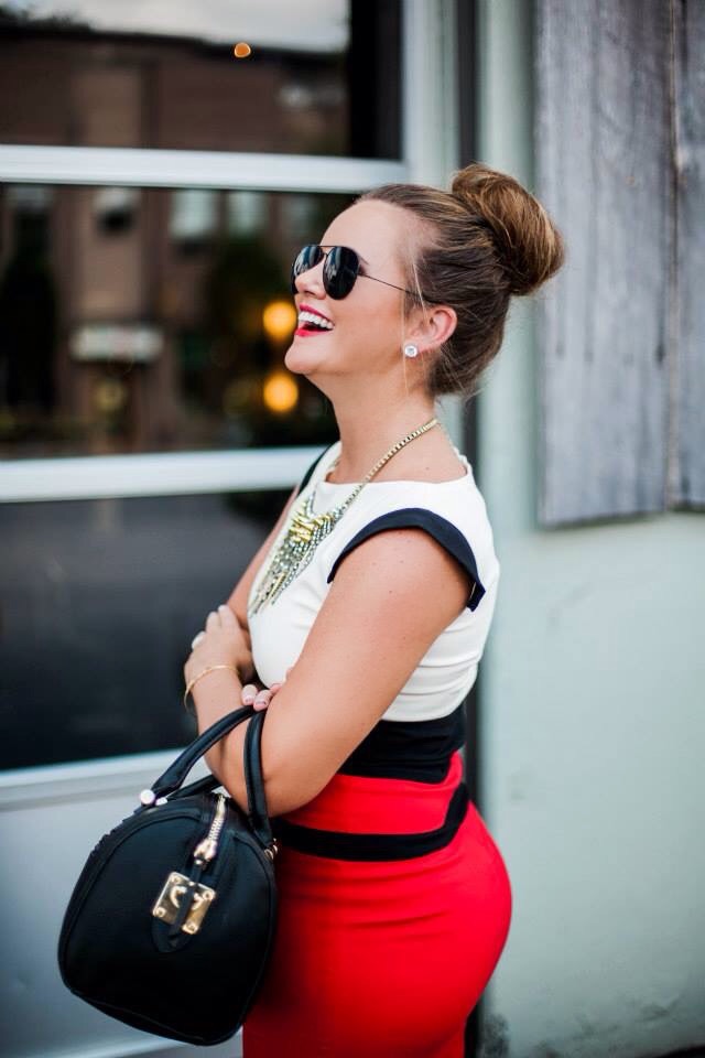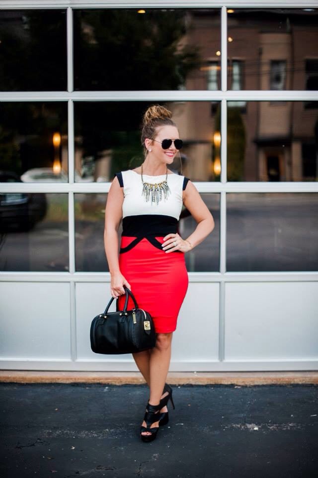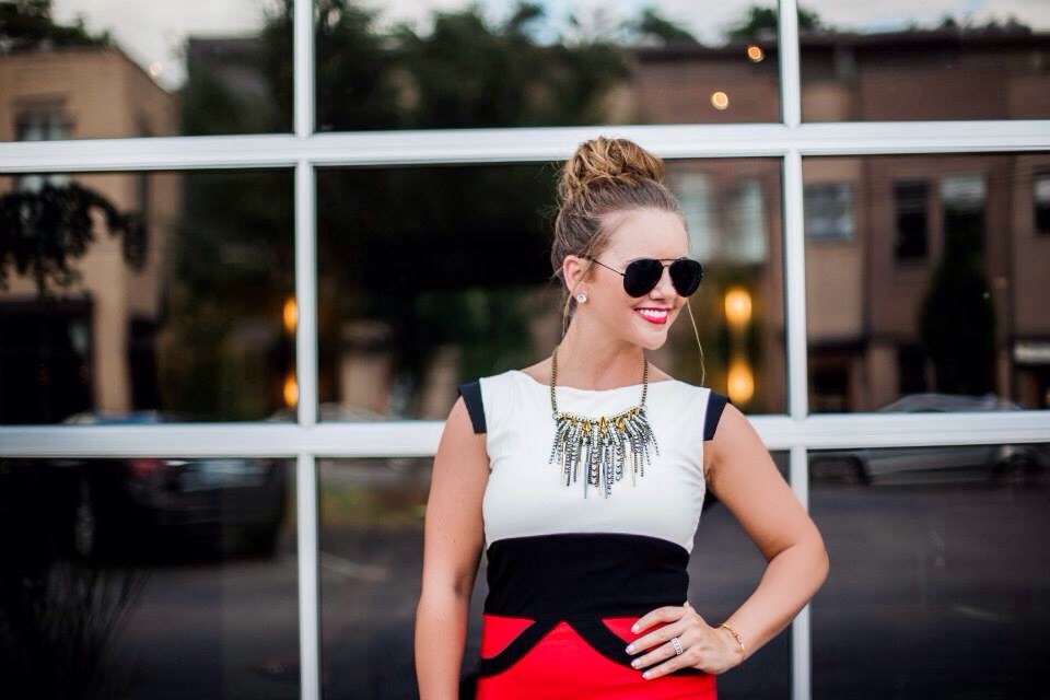 Typically I prefer to wear loose fitting dresses but when I saw this Tempest “pencil dress”, all of a sudden had an urge to wear something more form fitting (well, if we are being honest here…body hugging like a GLOVE!). I’m loving the color blocking and the detail of this dress (black trim on sleeves the sleeves and scalloped detail at the hip line). I feel something fierce in this dress and I totally had a #girlboss moment when shooting this look as well! And how AMAZING is this fun edgy statement necklace from Shop Prima Dona?! I love the rhinestones and spikes…they make the perfect duo and I also LOVE that it is on sale for $15.00, such a steal!