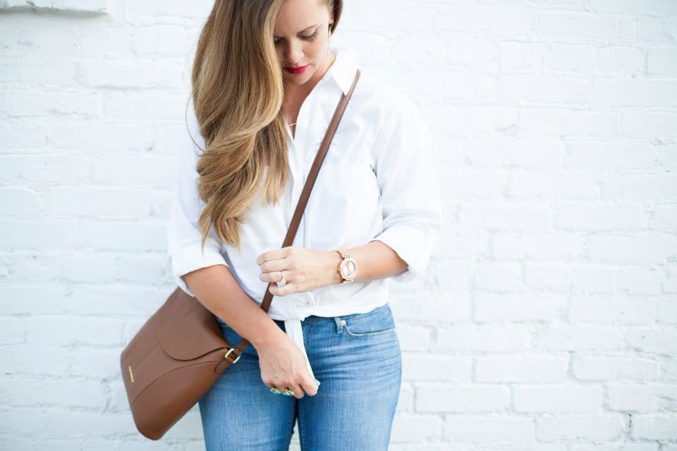 This outfit is fab!! I'm loving the chic look of the crisp white shirt with the jeans & pretty brown leather bag!! Perfection! <3