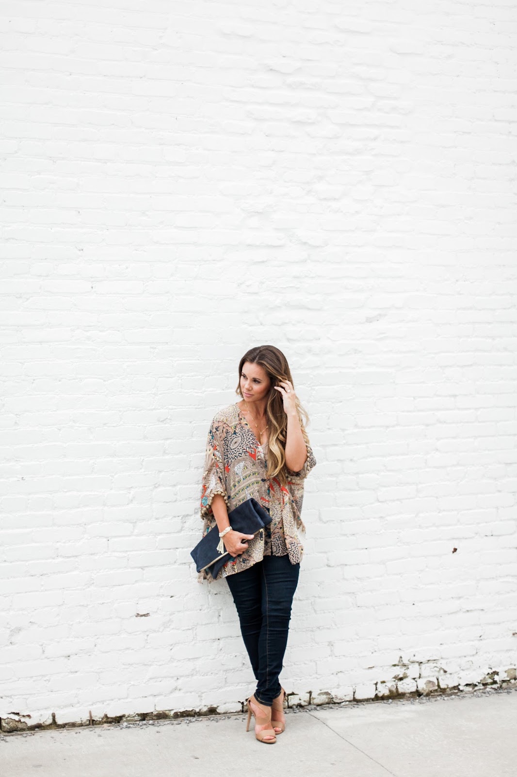 KIMONO: VIVA LA JEWELS (USE CODE KBSTYLED FOR 10% OFF) | DENIM: TARGET | CLUTCH: CERI HOOVER | NECKLACE: BAUBLEBAR (SIMILAR HERE) | EARRINGS: KENDRA SCOTT | BRACELET: KENDRA SCOTT | HEELS: SIMILAR HERE